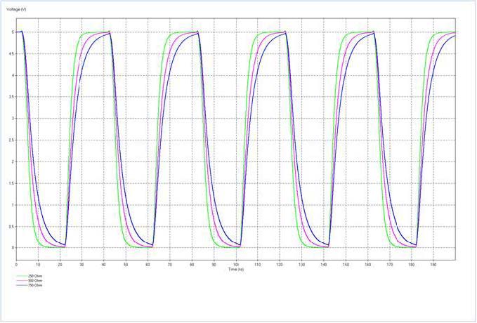 Figure 7. Simulation results (using IBIS model) for HSCT/HSSL configuration with dedicated supplies for both master and slave, with 500 Ohm resistor far-end termination at slave SYSCLK input for over-load current reduction. Slopes for recommended case 500 Ohm for VEXT 5V supply.