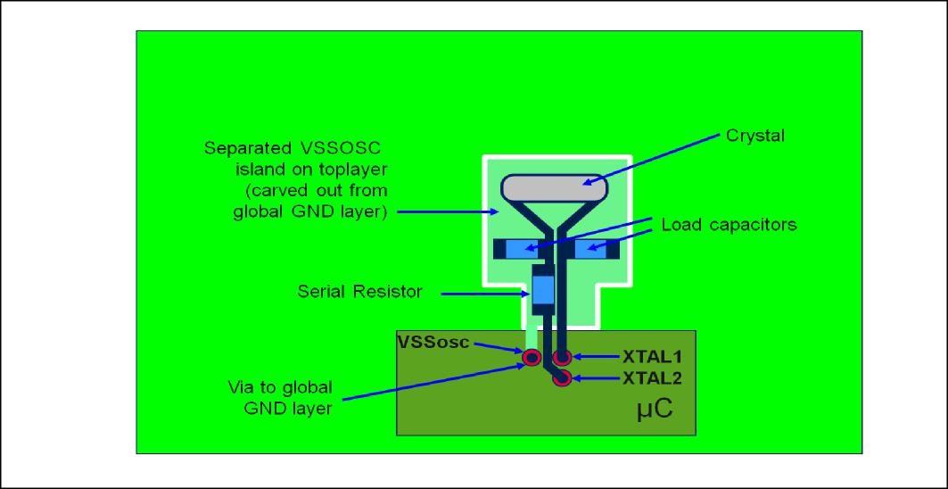 To reduce the radiation / coupling from the oscillator circuit, a separated ground island on the GND layer should be made. This ground island can be connected at one point to the GND layer. This helps to keep noise generated by the oscillator circuit locally on this separated island. The ground connections of the load capacitors and VSSOSC should also be connected to this island. Traces for the load capacitors and Xtal should be as short as possible.