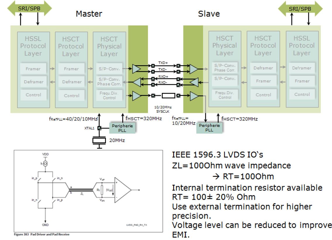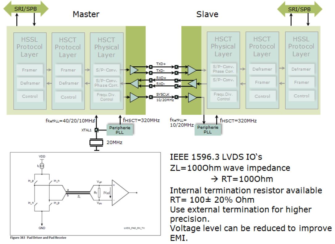 Over-load reduction can be achieved by using a serial resistor placed close to the receiver input, with far- end termination at the SYSCLK slave. The serial resistor should be as small as possible to avoid degradation of HSCT/HSSL bit-error rate.