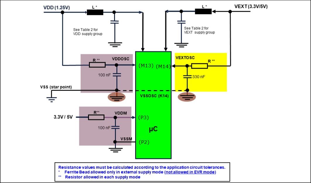 Figure 4. Filtering of VDDOSC, VEXTOSC and VDDM supply pins