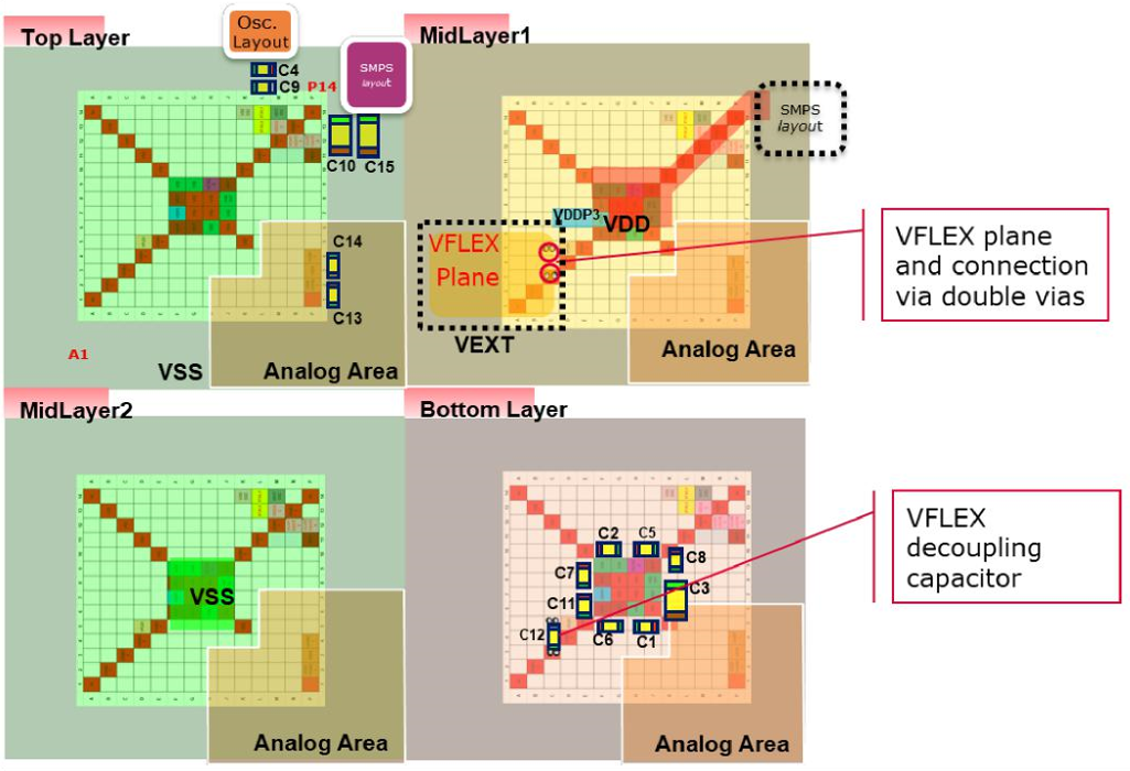 Below is an example layout and recommended capacitor list given for the BGA-180 type package of the AURIX™ TC3xx family. Planes are recommended for digital supplies. For analog supplies, no planes are recommended; no noisy traces should be routed through the “Analog areas” marked in the pictures below.