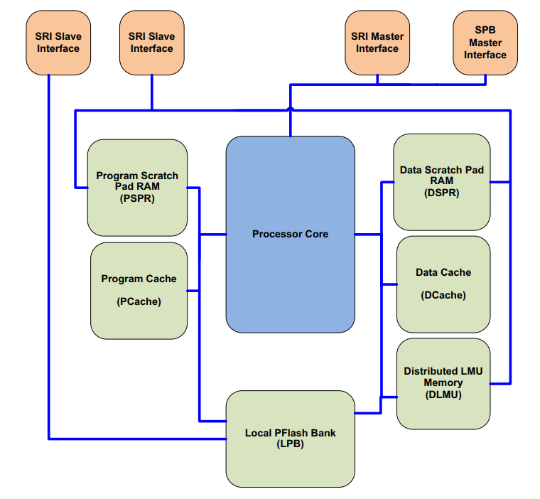 The processor core connects to memories and bus interfaces like Data Scratchpad SRAM (DSPR), Program Scratchpad SRAM (PSPR), Data Cache (DCache), Program Cache (PCache), Distributed LMU memory (DLMU), etc.