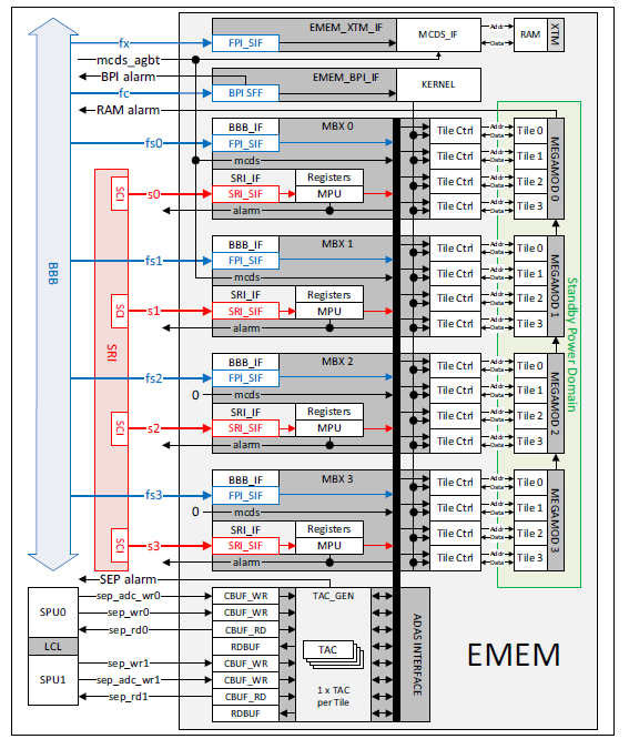 The EMEM contains RAM blocks (EMEM Tiles) which can be alternatively used for application (ADAS), calibration or trace data storage. The EMEM has interfaces to MCDS, SEP, SRI and BBB.