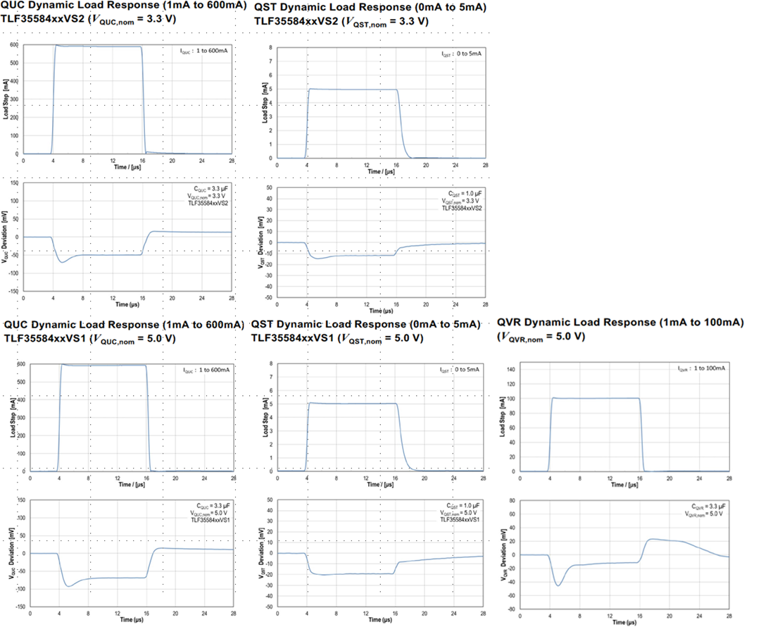 The load at the QUC output is mainly defined by the total leakage of the microcontroller during start-up. The load parameter is not a constant value and changes during the supply voltage ramp with the linear increase of the leakage and further start-up of the modules at this time. Therefore for example the EVRC starts up during LVD reset release and the QUC LDO sees this change while regulating the input voltage of the EVRC. Similarly, the QST output load changes when the PMS turns into run mode. For simplicity, such estimation assumes average load current values for various temperatures.