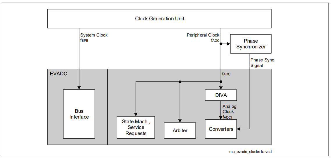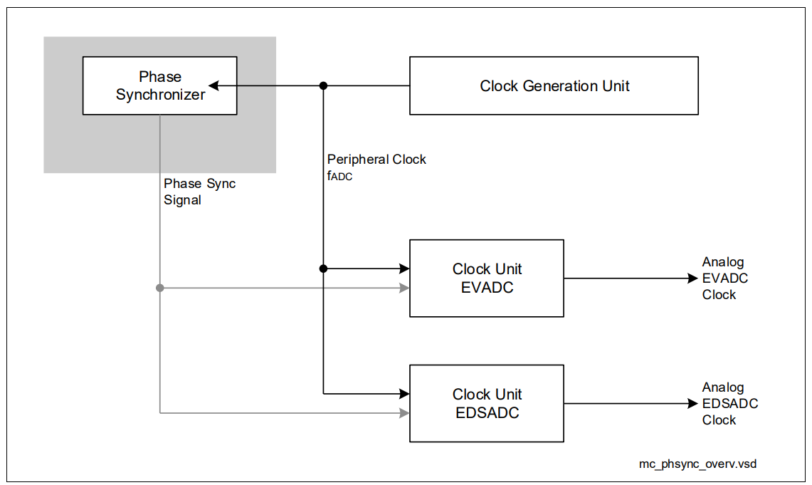 To eliminate the interference of concurrently operating ADC channels, the converters can operate in a synchronized way so each of them can reach its optimum performance. The Phase Synchronizer distributes a clock control signal which is used by the converters to generate a local clock signal. After reset, the clock synchronization is active within the converters. The Phase Synchronizer, therefore, must be configured to generate the clock synchronization signal. This synchronization signal is used within the EDSADC and the EVADC.