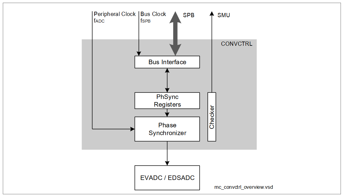 The converter control block summarizes control functions which are common for all converters implemented in the product. The Phase Synchronizer (PhSync) function provides a clock enable signal to synchronize the clock signals of all analog blocks. Furthermore, the converter control block contains the registers which are required to configure the associated functions.