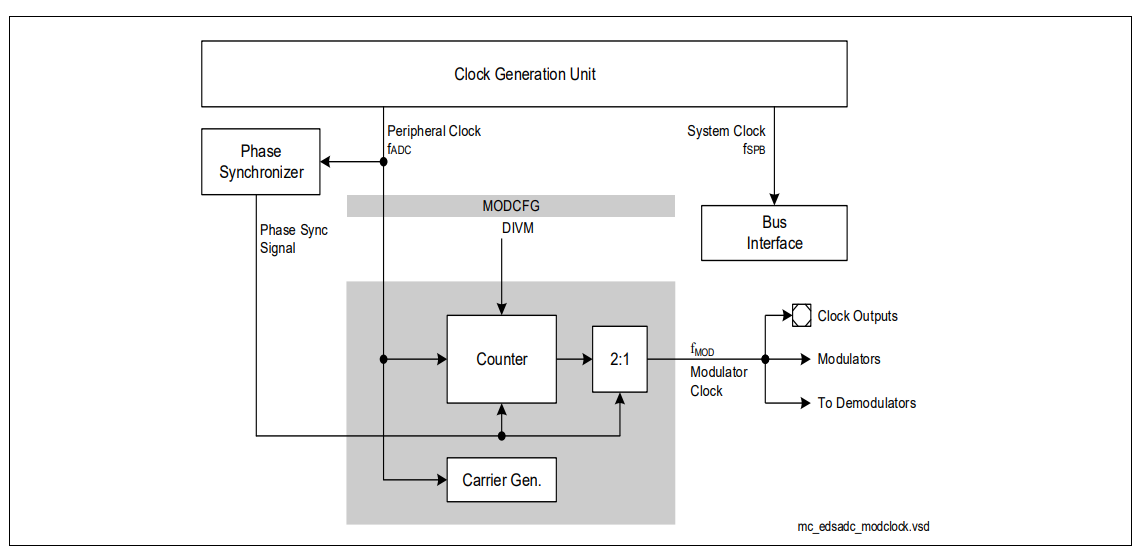 The EDSADC uses the synchronization signal directly to generate its modulator clock. Therefore, the phase synchronizer must be programmed according to the required EDSADC modulator frequency, i.e. fPHSYNC = fMOD. The EVADC uses the synchronization signal to start a conversion. Therefore, the analog clock of the EDVADC fADCI must be selected as an integer multiple of the phase synchronizer frequency, i.e. fADCI = fPHSYNC or fADCI = fPHSYNC × 2.