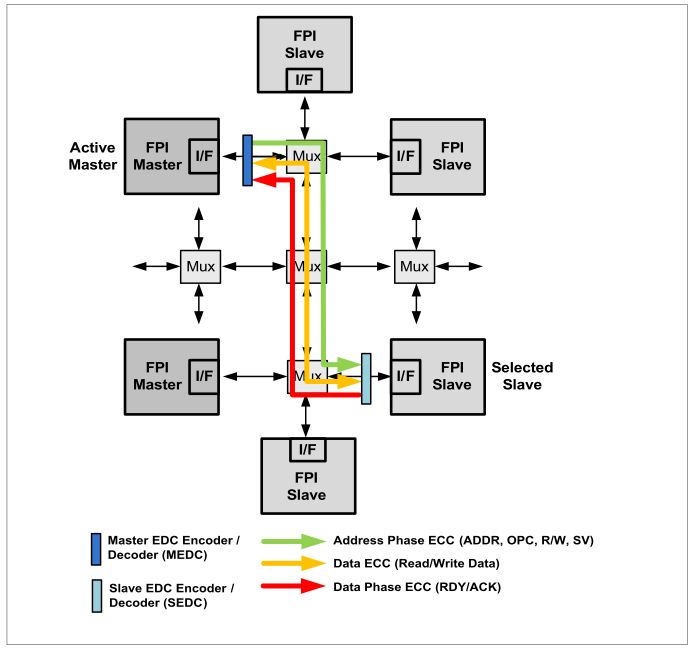 The arbitration of the FPI interconnection is carried out by the BCU of the FPI. In the event of a transaction error, the BCU reports an alarm to the safety management unit (SMU). It can also generate an interruption request and collect information about the transaction that led to the transaction error.