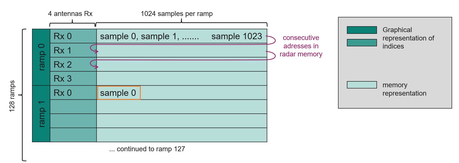 is used to represent the flat 1D data array stored in Radar Memory. The two left columns are used as indices for – depending on context – antenna, ramp or sample index.