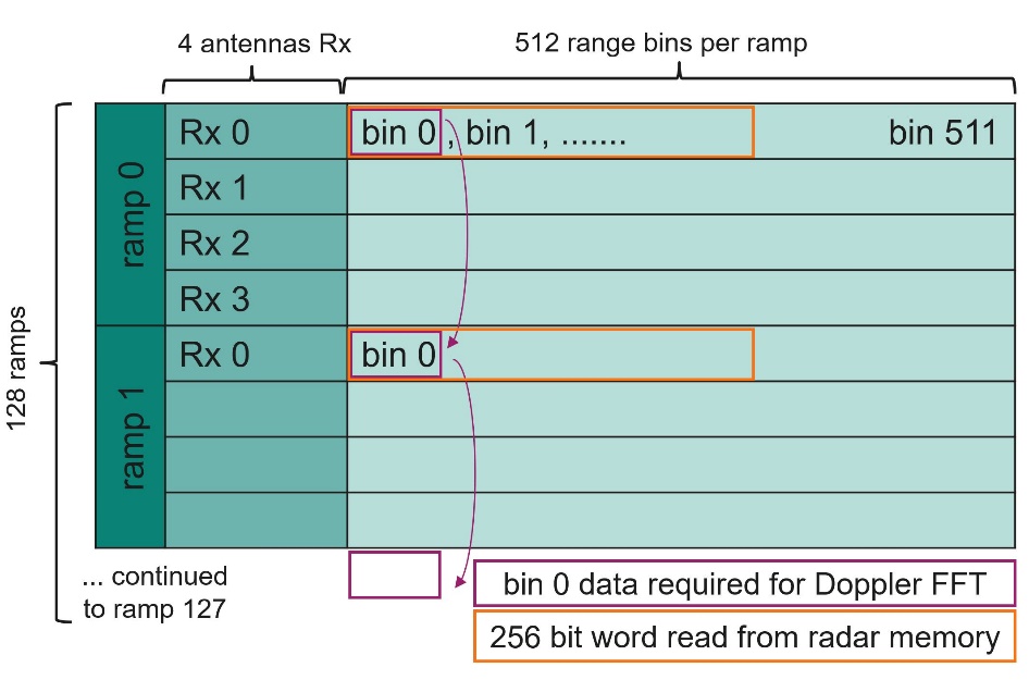 . In this case, the bins in Radar Memory to be used as consecutive input bins for each FFT dataset are stored in consecutive addresses in Radar Memory hence, each 256 bit read fetches multiple samples for the same FFT, e.g., four, eight, or sixteen bins depending on the precision of the data used. Note that in the value of inner and outer loop offset the number of samples and the number of antennae needs to be considered.