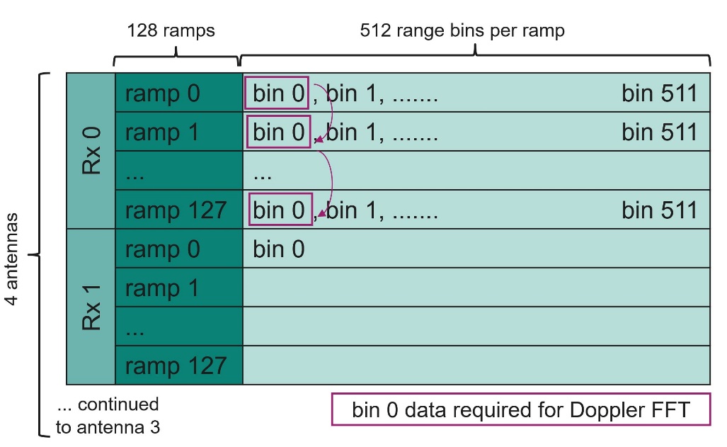 In many cases in radar processing the first (range) FFT is followed by a second FFT referred to as Doppler FFT. This FFT is performed accross all ramps of a dedicated range bin of a dedicated anteannae. The data that the input DMA needs to read for this Doppler FFT is marked in purple in