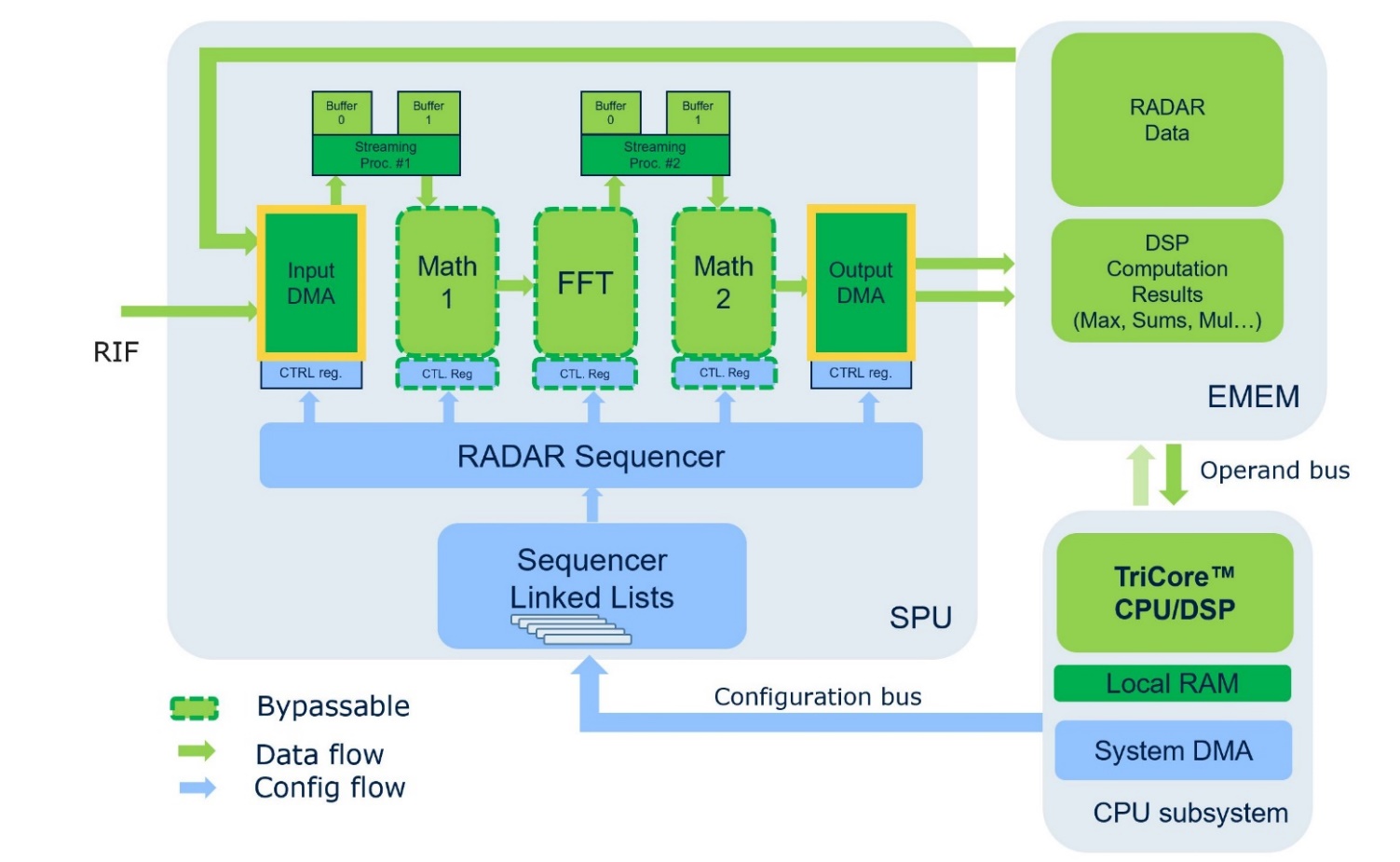 shows input and output DMA (marked in yellow) in the SPU subsystem. The input DMA engine can either passively accept data pushed by the analog-digital-converter (ADC) interfaces (RIF or Radar Interface) or actively load data of an existing data cube from the Radar Memory also referred to as Extension Memory (EMEM). The task of the input DMA is to structure data in the buffer memory for subsequent processing in the SPU pipeline. Thus, the input DMA has to make sure that all data required to perform the configured processing steps is fed into the processing pipeline at a time. Examples where a complete data set is required include: