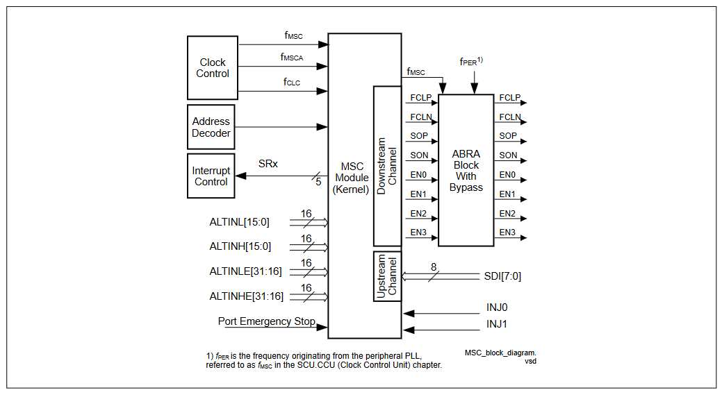 - Additional clock input selection is available, fSRI = 500 MHz. This clock selection with an additional clock divider offers the possibility to provide a MSC baud rate configuration up to 50 MHz without Asynchronous Baud Rate Adjustment (ABRA) usage