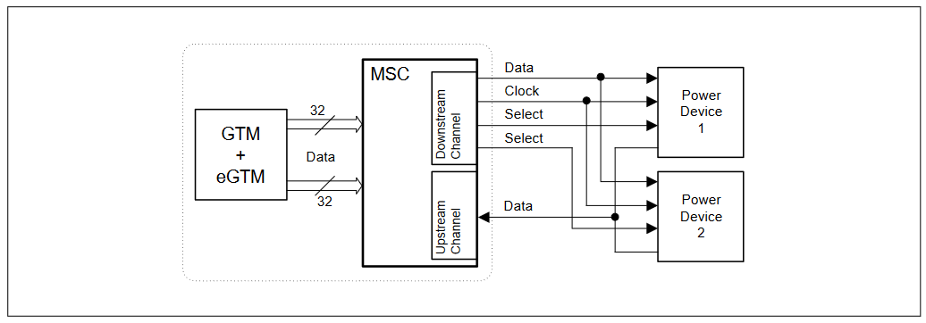 The MSC is a serial interface that is especially designed to connect external power switch devices. The serial data transmission capability minimizes the number of pins required to connect such external power switch devices. Parallel data information (coming from the timer units) or command information is sent out to the power switch device using a high-speed synchronous serial data stream (downstream channel). The MSC receives data and status back from the power switch device through a low-speed asynchronous serial data stream (upstream channel).