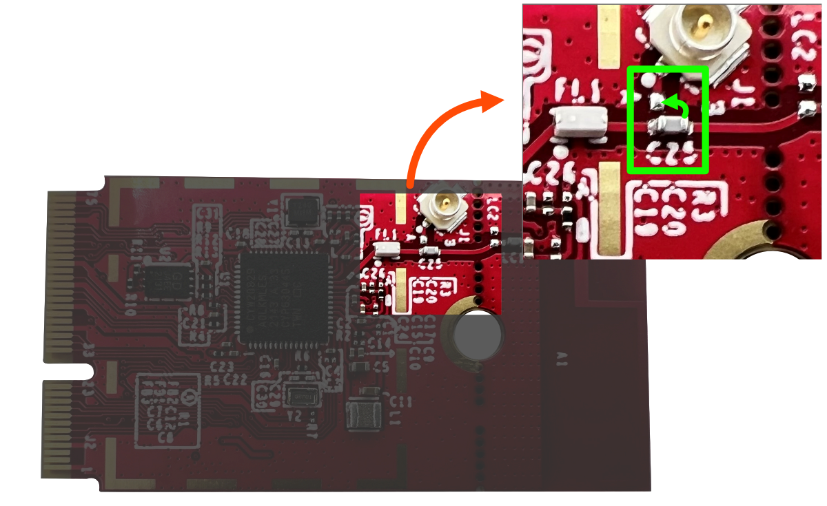 The external antenna is one of the preferred options to use in the long-range application. To use the external antenna, switch the capacitor (C25) on the CYW920829M2IPA1 (M.2 Card) towards the external antenna path, as shown in